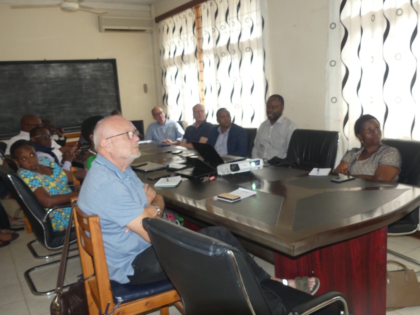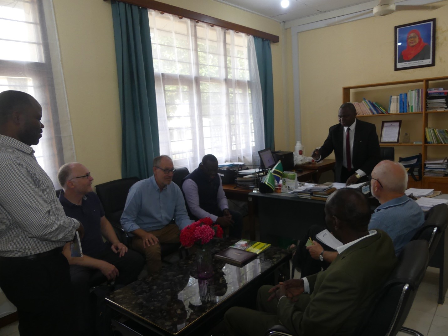 Delegates from ADRA-DK, ADRA-TZ and RECODA paying courtesy call to Prof. S.J. Kabote, CSSH Principal. From the Principal (in black suit) to left are Mr. Samuel Oyortey (ADRA Tz Director), Dr. Jens Vesterager (ADRA-DK Secretary General), Mr. Thomas Müller (ADRA-DK Board Chairman), Dr. E.T. Malisa (PI for K&M project, SUA), Dr D.E. Ringo (RECODA Director), Mr. Bjørn Johansen (ADRA-DK Programme Coordinator)