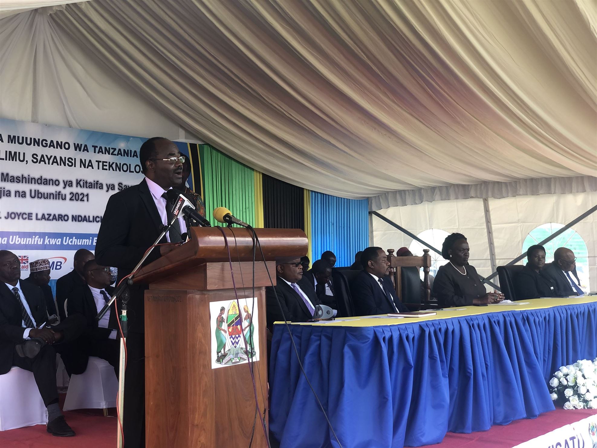 The General Secretary of the Ministry of Education, Science and Technology Dr. Leonard Akwilapo giving details of the MAKISATU 2021 competition before inviting the official guest to open the exhibition and the competition in Dodoma