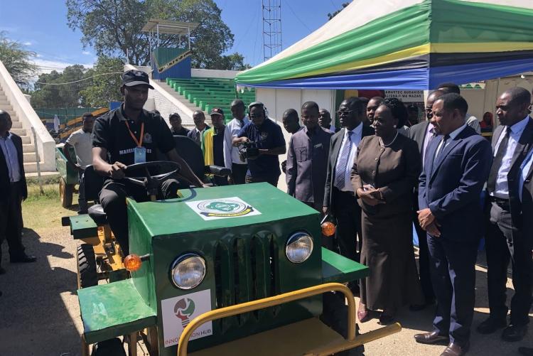 The Minister of Education, Science and Technology, Hon. Prof. Joyce Ndalichako and other officials watching FARM CART designer from SUA, Mr. Mussa Dotto showing how the farm tractor works during MAKISATU 2021 in Dodoma
