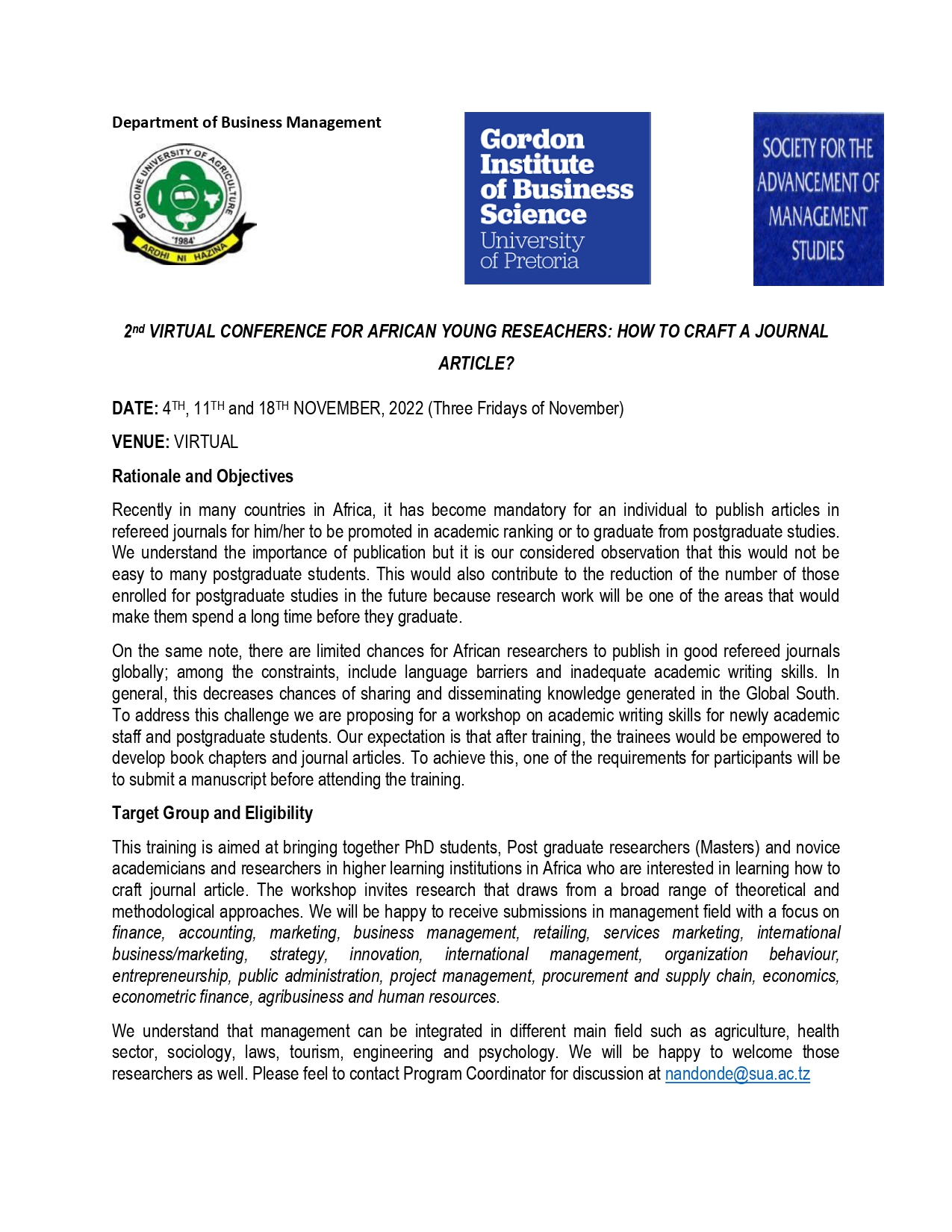 The Training Workshop is expected to be conducted at Sokoine University – Edward Moringe Campus(MAIN CAMPUS), Morogoro, Library Seminar Rooms.
