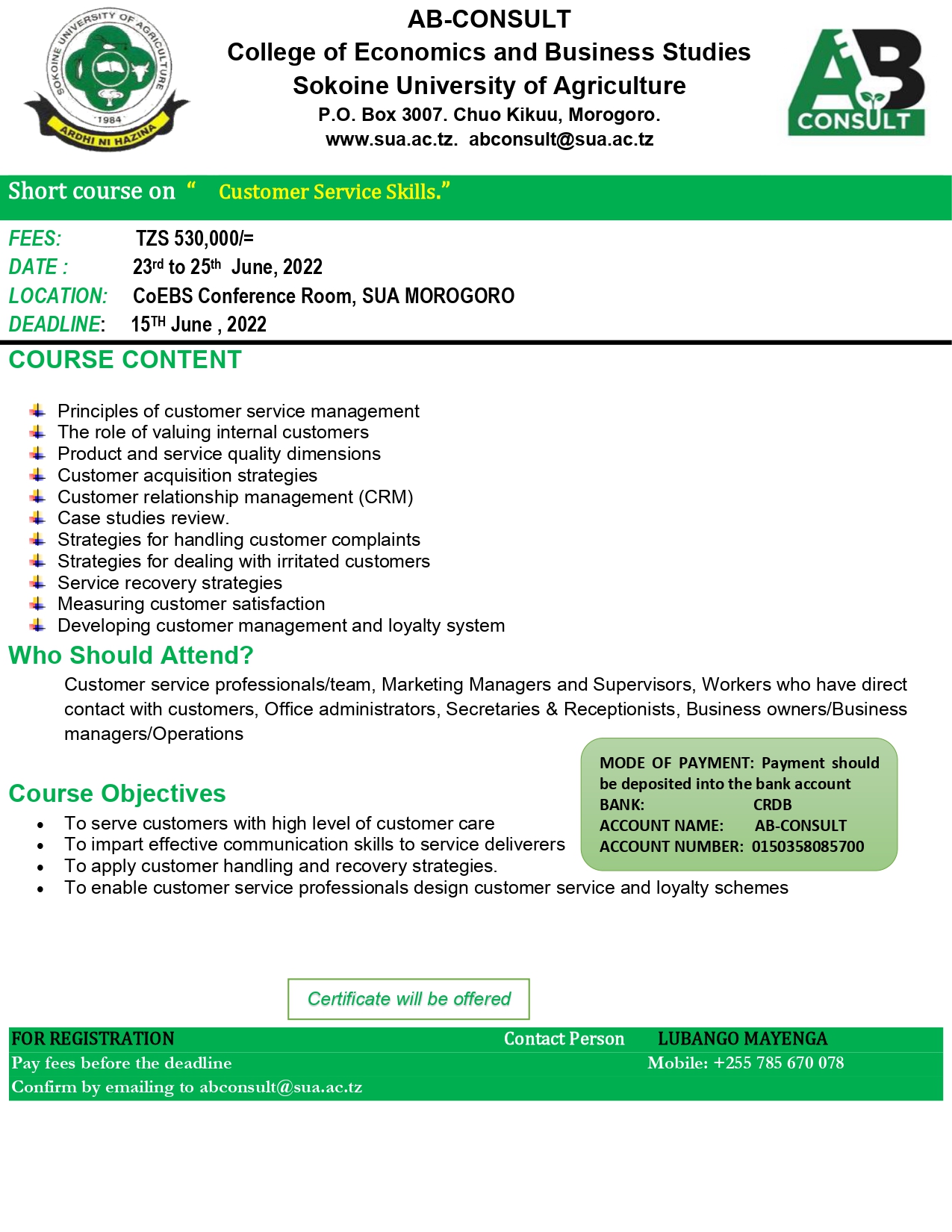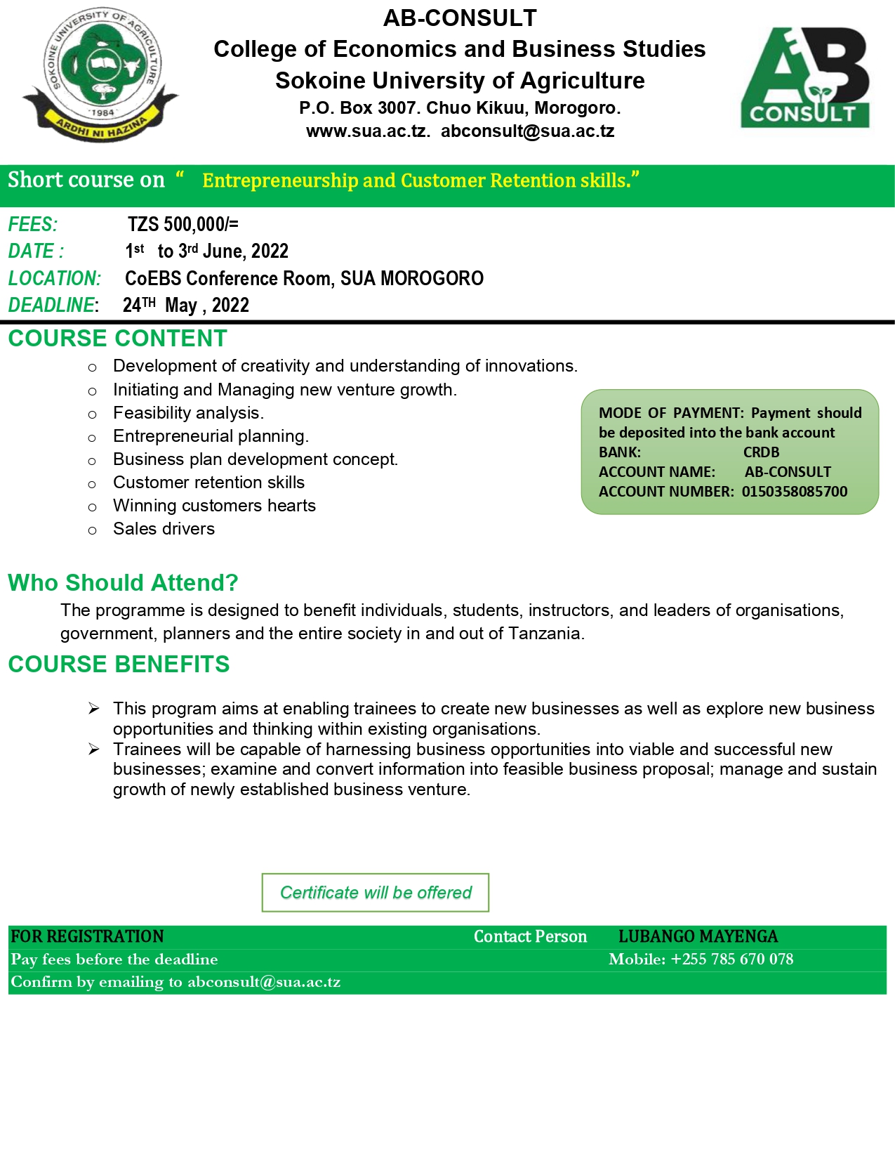 Payments should be made through SUA ICT Consulting Bureau   CRDB Bank: 0150369072400 SUA ITCB Bank account. Bank payment slips should be presented during registration, ITCB will provide all participants with an EFD receipt.